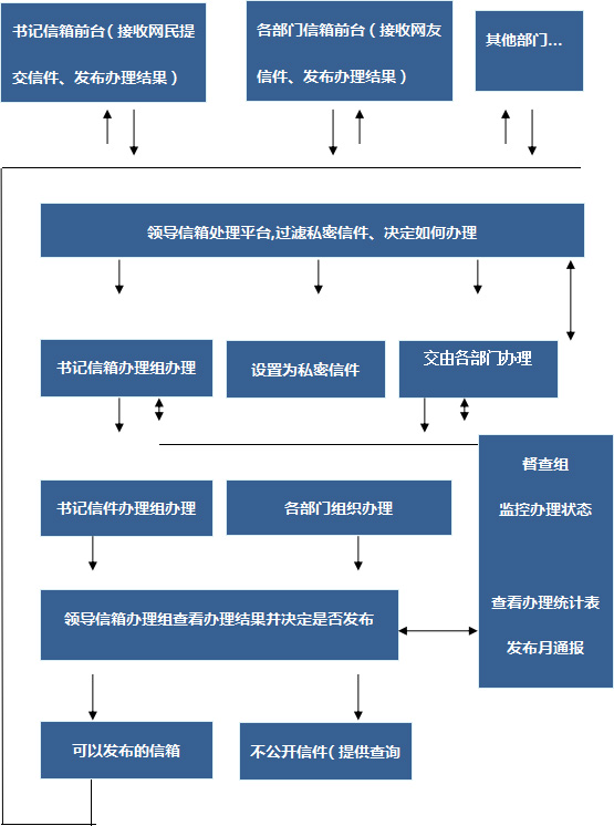 當書記(ji)信(xin)(xin)(xin)(xin)箱前臺或各部門網站前臺接收(shou)到新信(xin)(xin)(xin)(xin)件(jian)(jian)時(shi),由書記(ji)信(xin)(xin)(xin)(xin)箱辦(ban)理(li)(li)組審核人員對所有(you)信(xin)(xin)(xin)(xin)件(jian)(jian)進行過濾(lv),過濾(lv)后有(you)三種處理(li)(li)方式,分別(bie)為(wei)書記(ji)信(xin)(xin)(xin)(xin)箱辦(ban)理(li)(li)組辦(ban)理(li)(li)(此類信(xin)(xin)(xin)(xin)件(jian)(jian)是對社會影響重(zhong)大的信(xin)(xin)(xin)(xin)件(jian)(jian)或典型信(xin)(xin)(xin)(xin)件),私(si)密信(xin)件(jian),各部門自(zi)行(xing)(xing)辦(ban)(ban)(ban)(ban)理(li)(li)(此類信(xin)件(jian)是(shi)一般(ban)處(chu)理(li)(li)信(xin)件(jian));如果設為書記信(xin)箱辦(ban)(ban)(ban)(ban)理(li)(li)組辦(ban)(ban)(ban)(ban)理(li)(li)則由相關人員(yuan)組織對信(xin)件(jian)內容進行(xing)(xing)審實處(chu)理(li)(li),并錄(lu)入辦(ban)(ban)(ban)(ban)理(li)(li)結果。私(si)密信(xin)件(jian)由審核人員(yuan)決定(ding)處(chu)理(li)(li)方式(shi)和辦(ban)(ban)(ban)(ban)理(li)(li)流(liu)程(cheng);各部門自(zi)行(xing)(xing)辦(ban)(ban)(ban)(ban)理(li)(li)信(xin)件(jian)交在審核時明確辦(ban)(ban)(ban)(ban)結期限及辦(ban)(ban)(ban)(ban)結程(cheng)度;然后由各部門自(zi)行(xing)(xing)處(chu)理(li)(li)并錄(lu)入辦(ban)(ban)(ban)(ban)理(li)(li)結果;