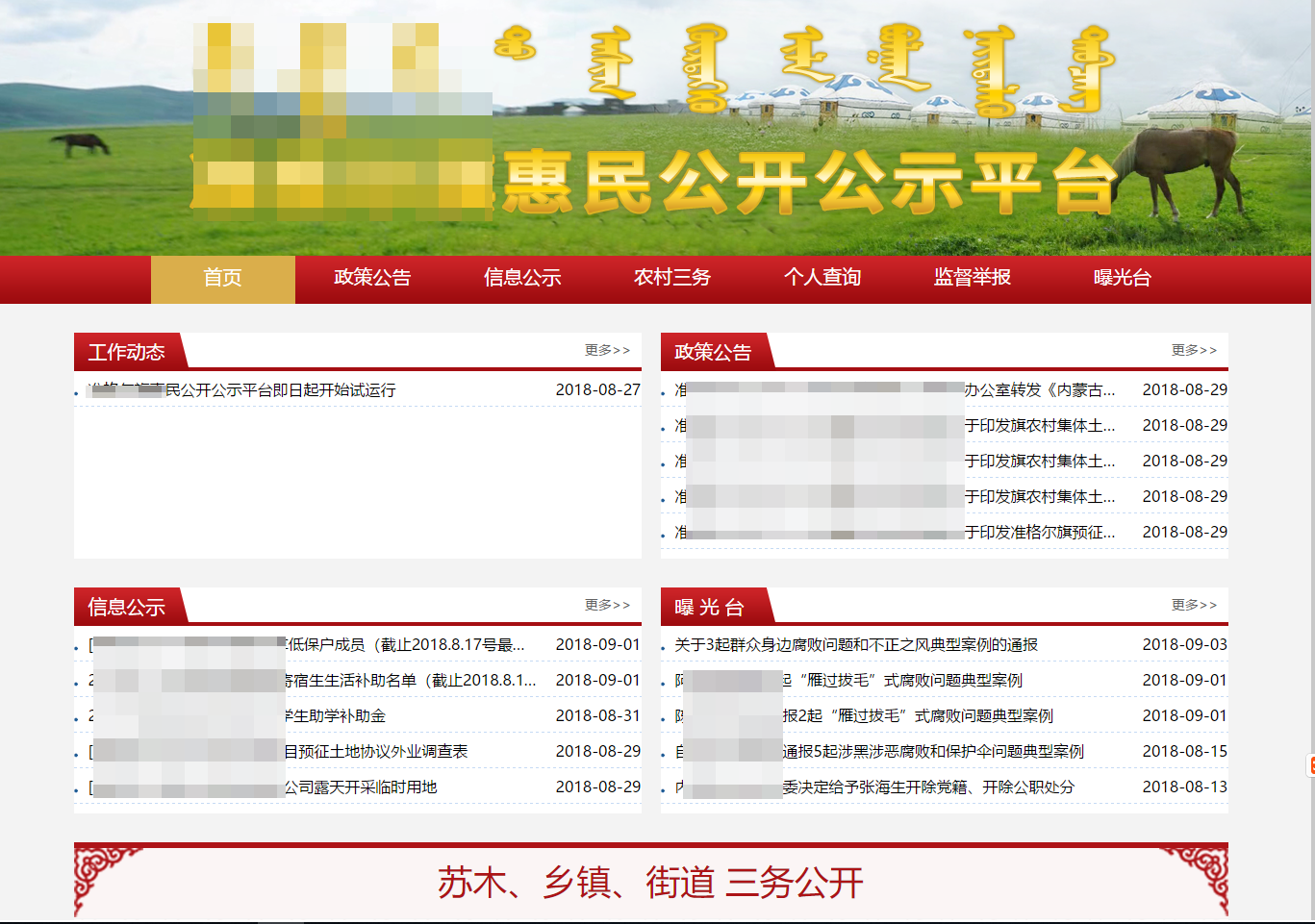 農(nong)村(cun)三(san)務:主要包括全(quan)旗14個(ge)(ge)蘇木、鄉(xiang)鎮(街道)下轄(xia)的194個(ge)(ge)嘎查、村(cun)(社(she)區)的三(san)務公開內容(rong)。