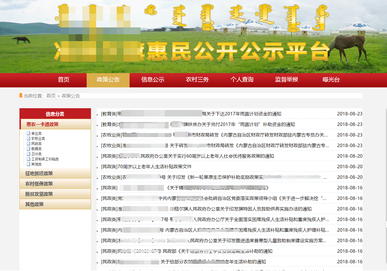 信息公(gong)示(shi):主(zhu)要是(shi)對各蘇木鄉鎮、街(jie)道(dao)執行和落實惠農一卡(ka)通政(zheng)(zheng)策(ce)(ce)、征地拆遷(qian)政(zheng)(zheng)策(ce)(ce)、農村低保政(zheng)(zheng)策(ce)(ce)、脫(tuo)貧攻堅政(zheng)(zheng)策(ce)(ce),以及其他政(zheng)(zheng)策(ce)(ce)的公(gong)示(shi)。