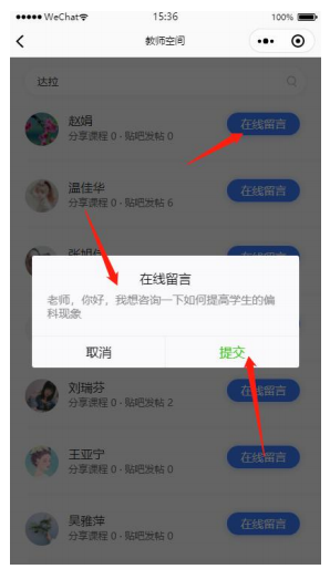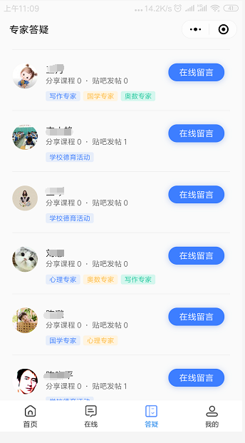 4. 專(zhuan)家答(da)疑(yi):是由學校、旗區、市區任意一級管理員給注(zhu)冊教(jiao)師(shi)賦予專(zhuan)項擅長的(de)標(biao)簽(qian),然后帶(dai)有標(biao)簽(qian)的(de)教(jiao)師(shi)展示在專(zhuan)家答(da)疑(yi)列表(biao),各位老(lao)師(shi)可以(yi)在次(ci)發起留言,進行咨詢互動學習。