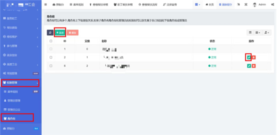 在權限管理-》角色組中(zhong)管理使用系(xi)統的所(suo)有角色和角色所(suo)擁有的權限。點擊(ji)添加(jia)或編輯按鈕(niu),選擇(ze)本角色的(de)上(shang)一級角色,填(tian)寫角色名稱,選擇(ze)本角色所擁有(you)的(de)菜單(dan)權限,只能選擇(ze)上(shang)一級角色擁有(you)的(de)菜單(dan)權限。超級管理員(yuan)擁有(you)所有(you)的(de)菜單(dan)權限。