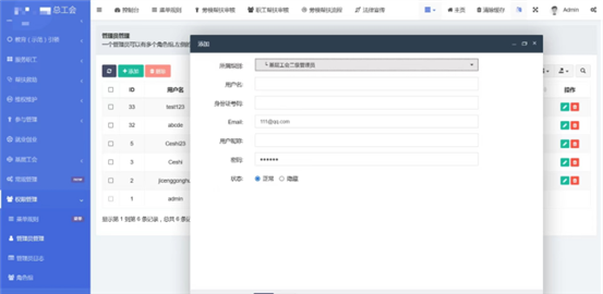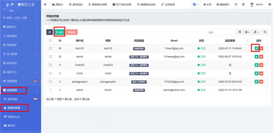 在權限管(guan)(guan)(guan)理-》管(guan)(guan)(guan)理員管(guan)(guan)(guan)理中(zhong)管(guan)(guan)(guan)理所(suo)有登錄系統后(hou)臺的賬(zhang)號和所(suo)屬角(jiao)色。添加(jia)或編輯管(guan)(guan)(guan)理員,選(xuan)擇所(suo)屬組別,選(xuan)擇后(hou)管(guan)(guan)(guan)理員擁(yong)有此組別設(she)置的菜單權限,輸入(ru)用(yong)戶名(ming)、身份證號碼(ma)(ma)、郵箱號碼(ma)(ma)、用(yong)戶昵稱、密(mi)碼(ma)(ma)。總工(gong)會(hui)在這里管(guan)(guan)(guan)理所(suo)有基層工(gong)會(hui)的賬(zhang)號,如用(yong)戶忘(wang)記密(mi)碼(ma)(ma)總工(gong)會(hui)管(guan)(guan)(guan)理員可以在這里為基層工(gong)會(hui)管(guan)(guan)(guan)理員修(xiu)改密(mi)碼(ma)(ma)。