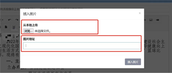 點擊上傳(chuan)圖片(pian)按鈕(niu),在彈出頁(ye)面(mian)中可以(yi)(yi)選(xuan)擇本地上傳(chuan),也(ye)可以(yi)(yi)輸入圖片(pian)網址插入圖片(pian)。也(ye)可以(yi)(yi)選(xuan)擇圖片(pian)庫中之前上傳(chuan)過的圖片(pian)。